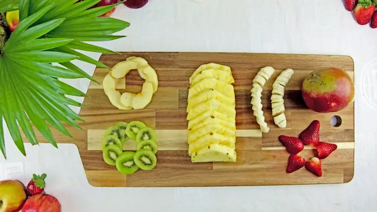 Ananas : Couper en tranches de 5 à 8 mm. Ou tranches de 1 cm en morceaux. Supprimer toute la peau et le centre du fruit.