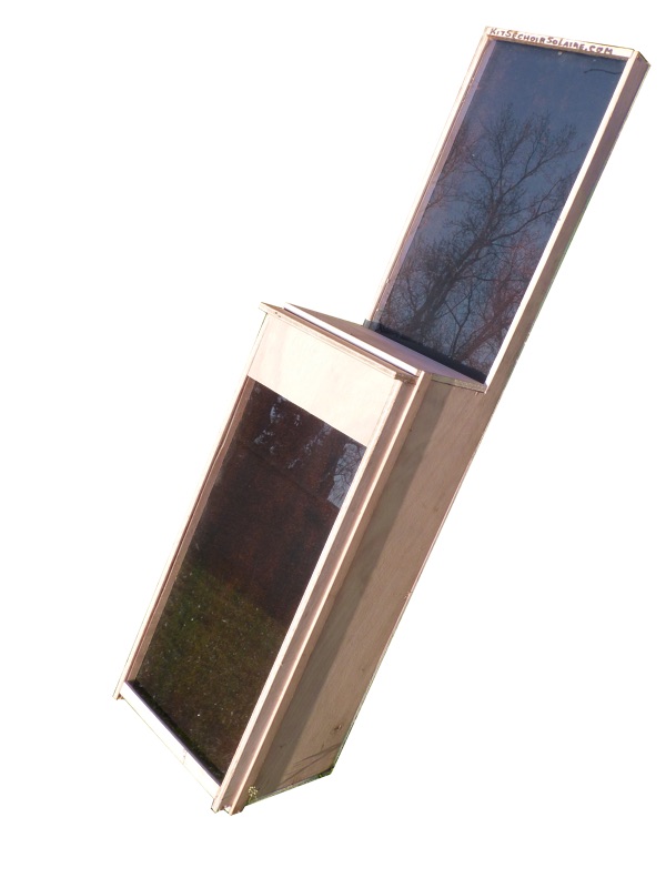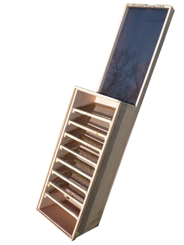 Le séchoir KSS se compose de bois, de verre, et de métal (la plaque chauffante noire). Une partie séchoir et une partie cheminée qui extrait l'air chaud chargé d'humidité.
