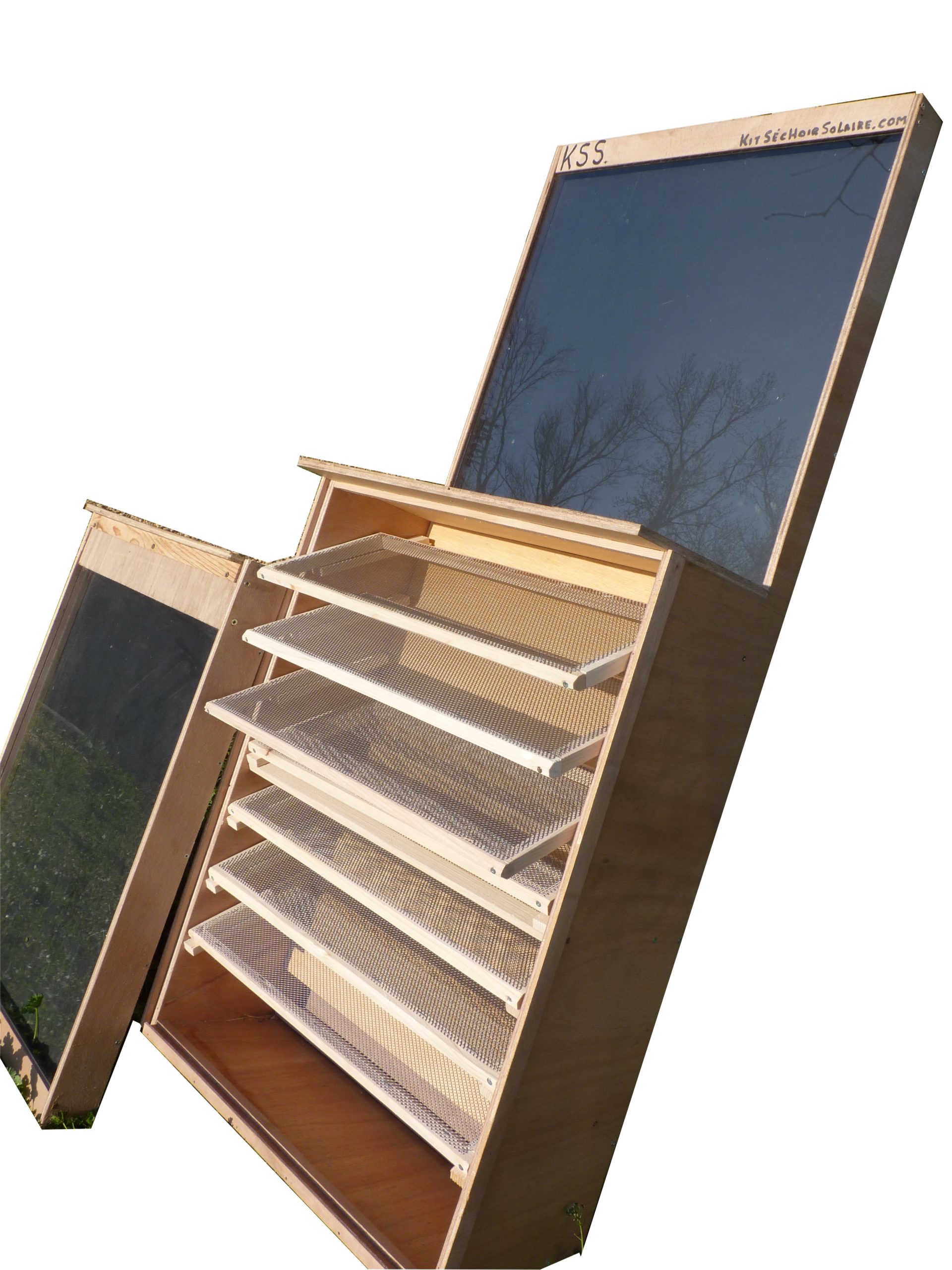 Le séchoir KSS se compose de bois, de polycarbonate (léger et incassable), et de métal (la plaque chauffante noire). Une partie séchoir et une partie cheminée qui extrait l’air chaud chargé d’humidité.
